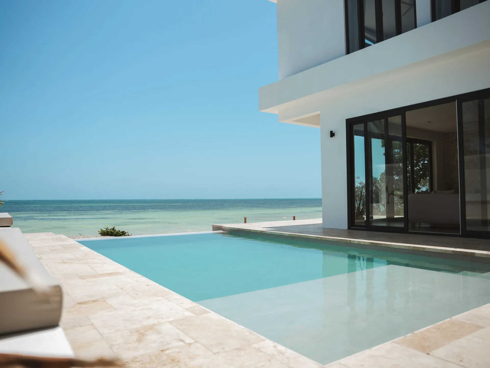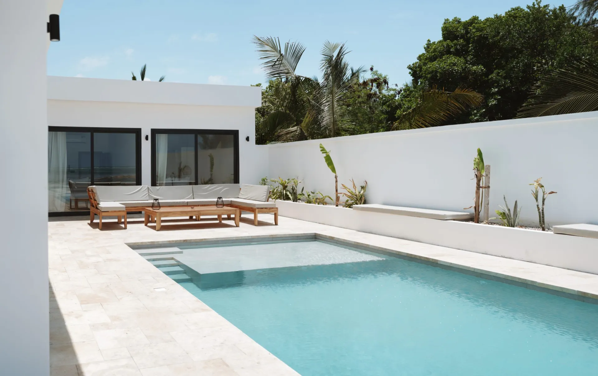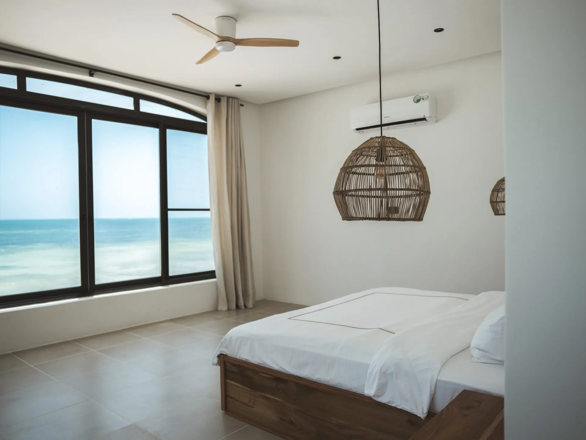 Les équipements comprennent une piscine à débordement donnant sur l'océan, trois terrasses (bord de piscine, niveau plage, rooftop), parking privé, accès direct à la plage et quartiers du personnel avec générateur et réservoirs d'eau.